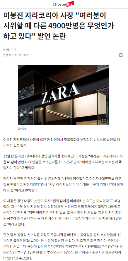 [출처: 중앙일보] 이봉진 자라코리아 사장 촛불집회 비하 발언 논란에 해명