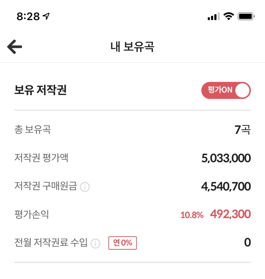 3. 체감 저작권료 수익률이 매우 낮다, 거의 껌값너낌. (우수리 떼고 통장에 꽂히는 건 연 수익률 기준 2% 전후; 물론 수익률은 곡마다 다르며 매수금액이 낮다면 또 다를 수 있다.)
