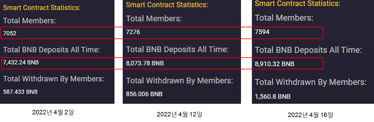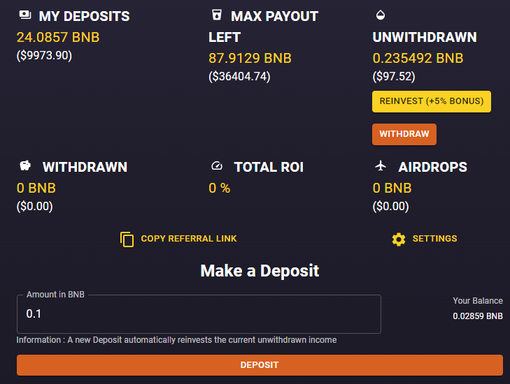 100만 원 상당의 BNB를 Deposit! -> Max payout은 365만 원 (상당의 BNB) -> 이를 하루에 1.5% (약 1만 5천 원의 BNB)를 243일 동안 지급. (* 67일 차에 원금 회수 가능)