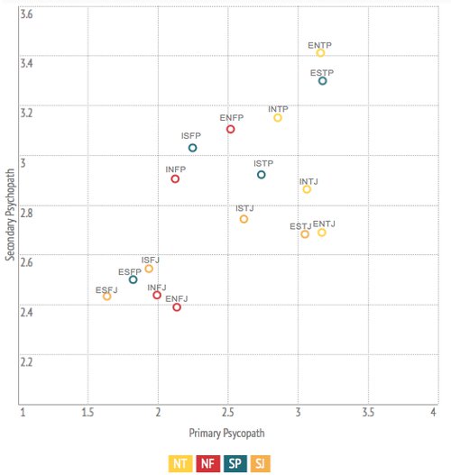 아래 그래프는 싸이코패스 성향조사인데 여기도 ESTP와 ENTP가 압도적으로 상위 랭크되어 있네요. X축은 Primary Psychopath 성향 정도를 나타내며 이는 영화에서 자주 보던 치밀하고 냉철한 싸이코패스의 성격을 나타내고 Y축의 Secondary는 보다 우발적이고 즉흥적인 Psychopath 성향을 나타냅니다.