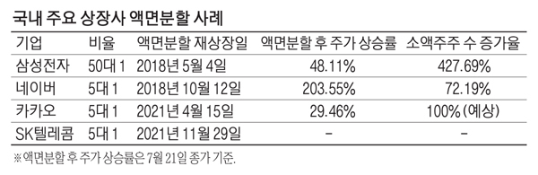 평균적으로 액면분할 3개월 뒤 S&P500 지수가 평균 2.1% 오르는 동안 액면분할 종목 주가는 평균 7.8% 뛰었다. (주가 상승폭 격차는 시간이 갈수록 더 벌어짐.) 저스틴 포스트 BofA 애널리스트는 과거의 높은 액면분할 효과가 이번에도 되풀이될지는 알 수 없지만 액면분할이 주가에 긍정적인 영향을 줄 것이라는 점은 확실하다고 분석했다.