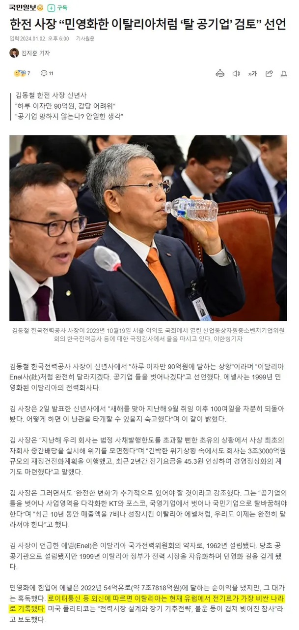 한전 사장 “민영화한 이탈리아처럼 ‘탈 공기업’ 검토” 선언